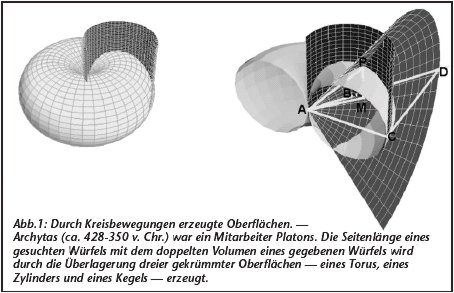 In Abbildung 1 sehen wir seine berühmte Konstruktion. Man findet die gesuchte Seitenlänge durch den Schnitt dreier Oberflächen - eines Torus, eines Zylinders und eines Kegels. Jede dieser Oberflächen, man könnte sagen, jede dieser Geometrien, verkörpert eine bestimmte Form der Wirkung. Alles beruht auf dem universellen Begriff der kreisförmigen Drehwirkung.