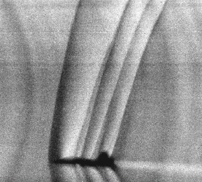 Hier sehen wir eine sog. "Schlierenphotographie" (Abbildung 2). Es ist eigentlich keine Photographie, sondern eine Methode, die Wirkung der Schockwellen, die ein Überschallflugzeug auslöst, sichtbar zu machen. Man sieht eine ganze Menge Wellen, die sehr weit vom Flugzeug entfernt und für das normale Auge unsichtbar sind.