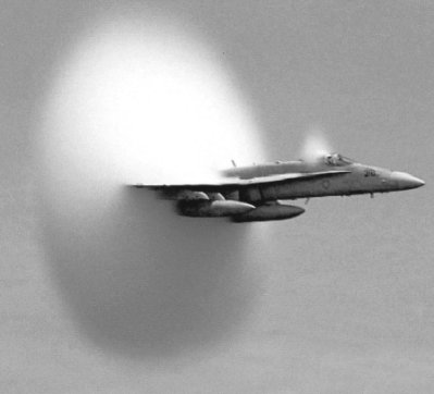 Abb. 3: Ein Überschallflugzeug durchbricht die Schallmauer. Diese Aufnahme stammt aus einem Film, den Dr. Tennenbaum vorführte: Ein Flugzeug der US-Marine vom Typ F/A-18 "Hornet" erzeugt beim Durchbrechen der Schallmauer eine Schockwelle, die kurzfristig als "Wolke" sichtbar wird.