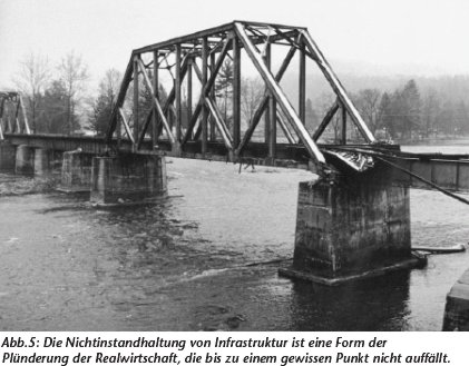 In Abbildung 5 sehen wir ein Beispiel dafür, wie die Infrastruktur langfristig verfällt. Brücken halten nicht ewig. Wenn man nichts tut, stürzen sie irgendwann ein. Das ist eine der üblichen Methoden der