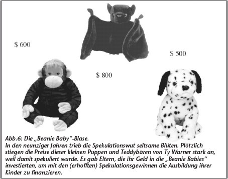 In Abbildung 6 sehen Sie die Beanie Babys, kleine Puppen oder Teddybären von einem Mann namens Ty Warner, um die sich Ende der 90er Jahre verrückte Spekulationen entwickelten. Diese Plüschtiere wurden für 600 oder 1000 Dollar das Stück gehandelt, weil die Leute damit spekulierten. Sie haben sie gesammelt und warteten darauf, daß sie im Wert weiter stiegen, damit sie mit dem Erlös aus dem Verkauf die Collegeausbildung ihrer Kinder bezahlen könnten!