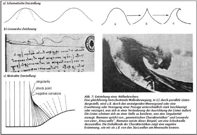 Abbildung 7 ist meine letzte Metapher hierfür. Sie zeigt, wie eine Sturzwelle (Brecher) entsteht, vergleichbar mit einer Schockwelle. Leonardo da Vinci hat das schon lange vor Riemann gut erfaßt. Seine Zeichnung zeigt den Übergang von einer gewöhnlichen Welle, die einer Sinuskurve ähnelt, zur Sturzwelle. Die Sinuswelle entspräche dem, was die Ökonomen heute als "Konjunkturzyklus" bezeichnen würden. Aber nun kommt es zu einer Wechselwirkung mit der Realwirtschaft, die in der Skizze als Änderung des Küstenverlaufs dargestellt ist. Die Kosten für den Erhalt der Gesellschaft steigen marginal, und das löst den Zusammenbruch des Finanzsystems aus. Umgekehrt verursacht der Versuch, das Finanzsystem zu erhalten, den Zusammenbruch der Realwirtschaft...